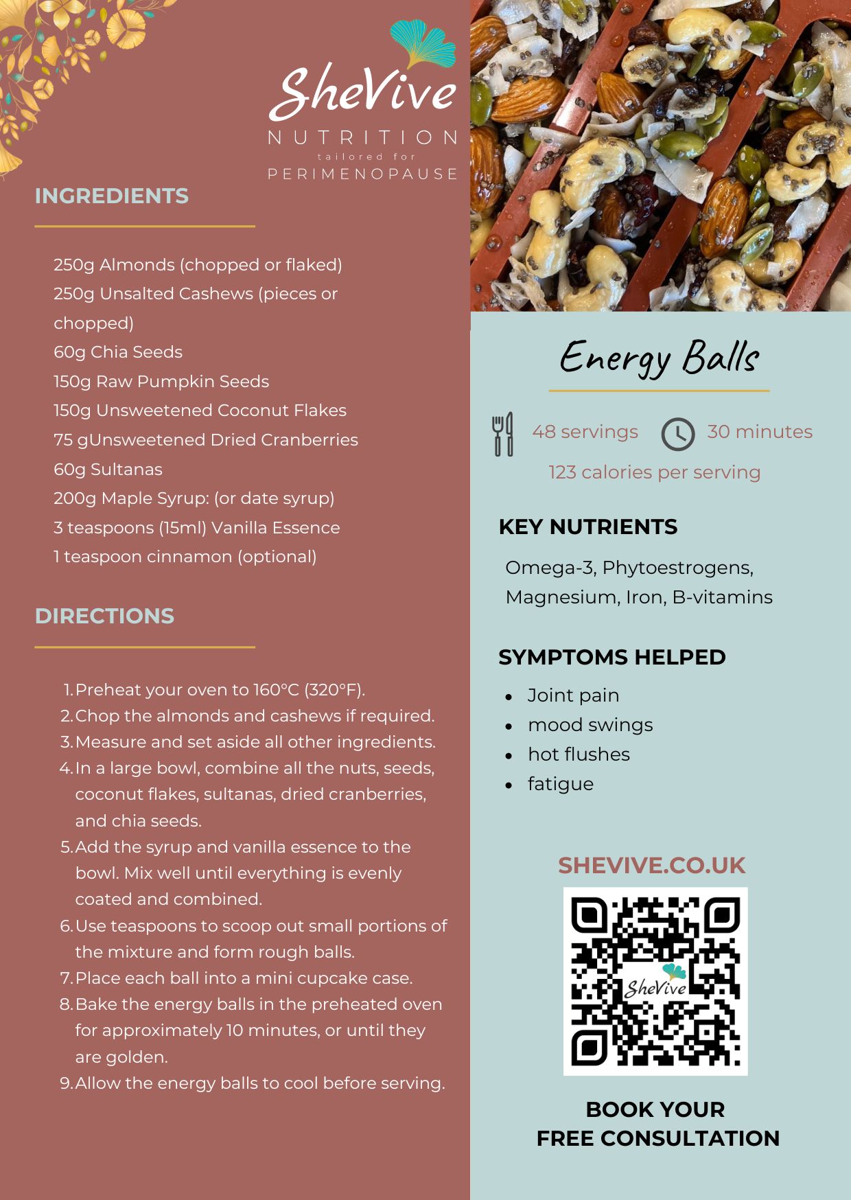 Many of you asked for the recipe for our Energy Balls which you sampled on the day. Packed full of nuts and seeds, they are rich in Omega-3 which reduce inflammation and help to ease joint pain, as well as Phytoestrogens to help balance hormones and elevate your mood.